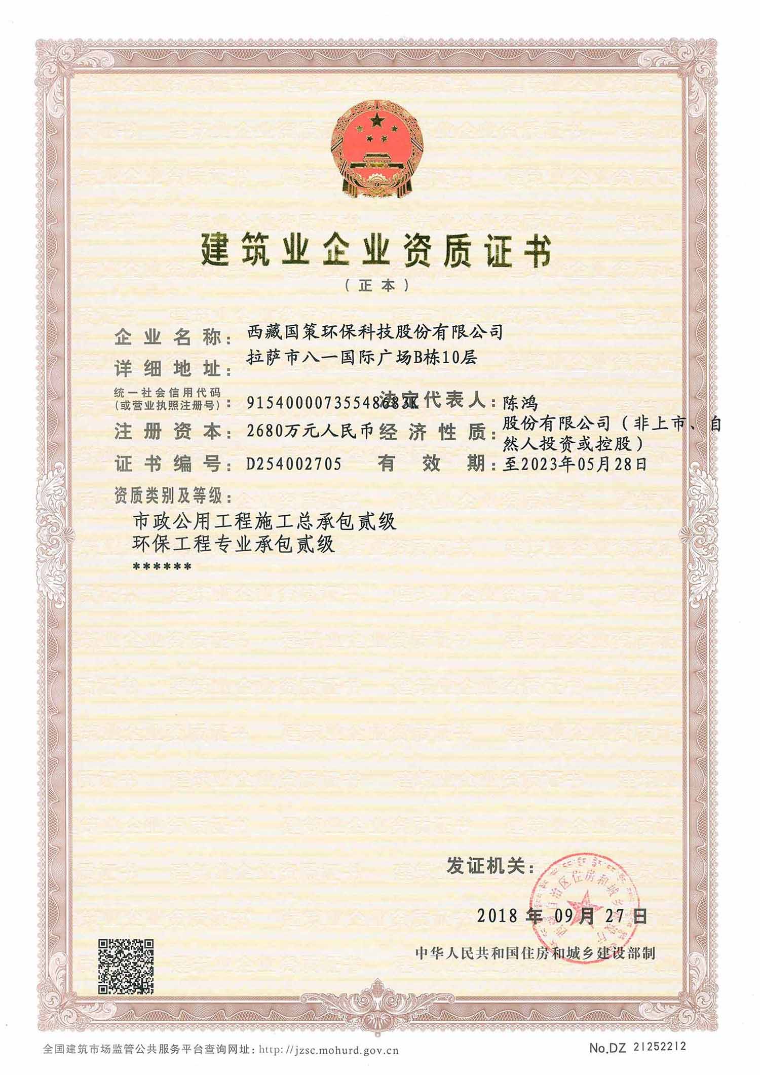 國策環(huán)保擁有住房和城鄉(xiāng)建設部頒發(fā)的建筑業(yè)企業(yè)市政公用工程施工總承包貳級資質、環(huán)保工程專業(yè)承包貳級資質,同時擁有環(huán)保、市政、機電等各類專業(yè)工程技術人員共計40余人,并先后承擔了眾多污水廠、垃圾填埋場、自來水廠、醫(yī)療廢物處置中心等項目的施工任務。
