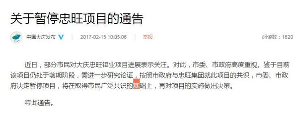 黑龍江大慶市委宣傳部官方微博今日發(fā)布《關(guān)于暫停忠旺項目的通告》稱,近日,部分市民對大慶忠旺鋁業(yè)項目進(jìn)展表示關(guān)注。對此,市委、市政府高度重視。鑒于目前該項目仍處于前期階段,需進(jìn)一步研究論證,按照市政府與忠旺集團(tuán)就此項目的共識,市委、市政府決定暫停項目,將在取得市民廣泛共識的基礎(chǔ)上,再對項目的實(shí)施做出決策。